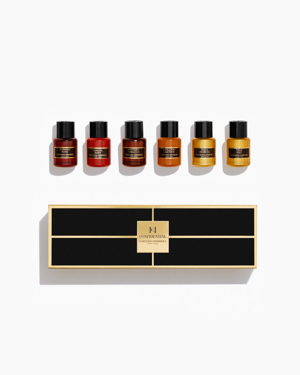 Carolina Herrera Confidential Giftset – 6x5ml – True Oud EDP Splash – Gold Incense EDP Splash – Stallion Leather EDP Splash – Sandal Ruby EDP Splash – Burn Rose EDP Splash – Mystery Tobacco EDP Splash
